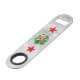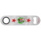 This bottle opener is white with a pattern of various circles and a cool skeleton holding ornaments up to his eyes in a Santa Hat inside a wavy bright green and red circle with a red star above and below him. Customise your name or text with the template.