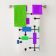 This towel set has a bath towel with a mid-century modern design of a grid made of horizontal and vertical black lines with rectangles in various vibrant shades of green, blue, and purple, a purple washcloth. and a green hand towel.
