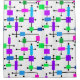 This shower curtain has a mid-century modern design of a grid made of horizontal and vertical black lines with rectangles in various vibrant shades of green, blue, and purple.