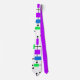 This necktie has a mid-century modern design of a grid made of horizontal and vertical black lines with rectangles in various vibrant shades of green, blue, and purple.