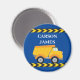Cool custom construction dump truck magnet for a child who loves yellow construction vehicles and blue magnets. Fun vehicle design for a little boy who loves cars and trucks. Customise with your kid's name under the black and yellow caution tape.