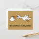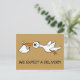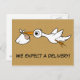 Cool pregnancy postcard. A cool comic cardboard postcard with stork with baby and a personal text: We are expecting a delivery! The perfect and original way to tell your friends you are expecting a baby!