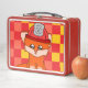 A cool lunch box featuring a firefighter (fire) like chequered pattern, a fire hat and a fox with a fire hat. The fox from the book "Firefighter Fox".