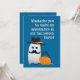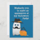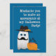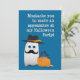 Personalise and customise invitation colour! Cool and cute Halloween invitation ghost with moustache cover so you can't recognise him. He is wearing black hat with orange feather and he carries a pumpkin bag full of candies from trick or treating.