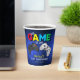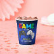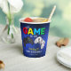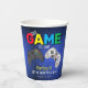How cool is these gaming birthday party paper cups! Perfect for gaming night parties. Super fun and colourful featuring a blue pixel background, the text "THE GAME IS ON!", two video game controllers, name, age and date of celebration. All text is easy to personalise.