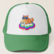 "Upgrade your streetwear game with this hilarious and colorful trucker hat! Featuring a cool chubby orange tabby cat wearing retro blue shades and chilling on a psychedelic rainbow cloud.