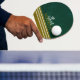 A table-tennis-paddle with a stylish and distressed dark green background, with olive stripes... to personalise with your own name.