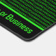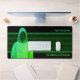 A cyber-themed design in shades of green on black, with a cool grungy effect on the hooded hacker and a background of binary ones and zeroes. Your name, company details or other text will appear in a coordinating vivid green. There's room for a business tagline, job title, security joke or hacking slogan in the upper right corner in bright aqua coloured lettering.