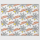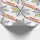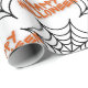 Celebrate Halloween with this cool wrapping paper featuring spider webs and spiders on a white background. Orange Happy Halloween text.