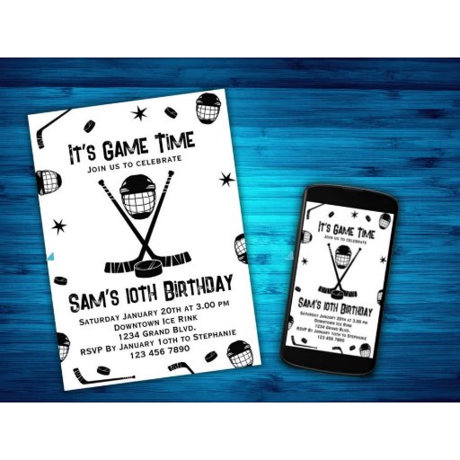 This ice-hockey birthday party design is part of a matching set of birthday party accessories. Your birthday kid is going to enjoy every moment of his special day. This design features a black and white pattern of hockey equipment, along with easy-to-read fonts, and plenty of space to add all of your unique information. For any special design needs, feel free to contact the designer, by sending an email to choosehappystudio@yahoo.com