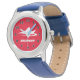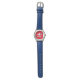 Cool jet fighter kid's watch with custom boys name. Personalised wrist watches for boys. Cute Holiday or Birthday gift idea for son, grandson, nephew, cousin, children etc. Blue and red dial design with aircraft and smart typography. Diameter around 33 mm. Blue or coloured leather strap. Water resistant up to 3 bar. Suitable for age four to twelve. Aviation theme gift ideas.