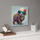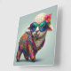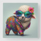 This image features a cute lamb dressed in a vibrant, patterned suit and wearing sunglasses, adding a lively and entertaining persona to the image. A flower is delicately placed on the sheep's right ear adding further charm to the character. This colourful sheep is set against a light-coloured background, further emphasizing the vivid details of the sheep's attire. The brightness of the colours and the playful details give the image a cheerful and eye-catching ambiance.