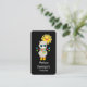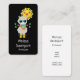 Vertical business cards with a cool looking llama wearing some dark sunglasses. Dressed in a colourful striped scarf and fun little boots. A bright yellow sun with a happy kawaii face in the background. Whimsical colourful triangles surround this fun loving llama. Black background.