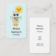 Vertical business cards with a cool looking llama wearing some dark sunglasses. Dressed in a colourful striped scarf and fun little boots. A bright yellow sun with a happy kawaii face in the background. Whimsical colourful triangles surround this fun loving llama. Blue background.