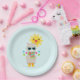 Paper plates with a cool looking llama wearing some dark sunglasses. Dressed in a colourful striped scarf and fun little boots. A bright yellow sun with a happy kawaii face in the background. Whimsical colourful triangles surround this fun loving llama. Blue background.