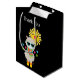 Thank you gift bag with a cool looking llama wearing some dark sunglasses. Dressed in a colourful striped scarf and fun little boots. A bright yellow sun with a happy kawaii face in the background. Whimsical colourful triangles surround this fun loving llama. Black background.