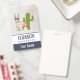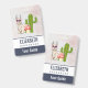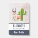 Personalised name badgeillustrated with a cute llama wearing heart-shaped sunglasses. A mushroom and a green cactus complete the illustration. Whimsical and cute.