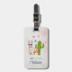 A personalised luggage tag illustrated with a cute llama wearing heart-shaped sunglasses. Some stars, a boho arrow, a red mushroom and a green cactus complete the illustration. Whimsical and cute.