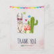 Thank you postcard Illustrated with a cute llama wearing heart-shaped sunglasses. Some stars, a mushroom and a green cactus complete the illustration. Whimsical and cute.
