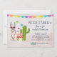 A birthday invitation with a fancy bunting banner along the top. Illustrated with a cute llama wearing heart-shaped sunglasses. Some stars, a mushroom and a green cactus complete the illustration. Whimsical and cute.