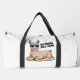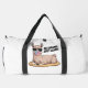 This white duffle bag features a charming cartoon llama wearing sunglasses and blowing a bubblegum bubble, with the text "NO DRAMA, JUST LLAMA." This quirky and humourous design is perfect for those who appreciate a peaceful, fun-loving attitude. Edit colour of the bag caps and body in the Design tool to your favored colours.
