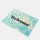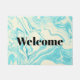A stylish and sophisticated welcome mat with an elegant faux marble pattern with swirling colours in turquoise blue and cream colours. Welcome written in a big bold font.