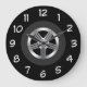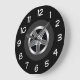 Cool automotive theme men's wall decor clocks designed with a car tire graphic and bold easy to read clock face numbers in a wall clock suitable for a guys office, home office, or man cave.