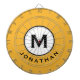 Cool modern dart board in mustard yellow, black and white with monogram initial and name below. Personalise with name and initial.