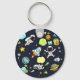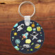 A keychain with a cute and colourful pattern with all kinds of outer space themed elements. Images include astronauts floating around in their white space suits. Stars and planets and cool little rocket ships, spaceships, and satellites. Fun and crazy design.