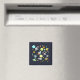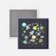 A magnet with a cute and colourful pattern with all kinds of outer space themed elements. Images include astronauts floating around in their white space suits. Stars and planets and cool little rocket ships, spaceships, and satellites. Fun and crazy design.