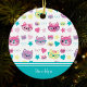 Add a cute touch to your home holiday tree decor with this adorable Christmas ornament that features cool pastel cats wearing fun glasses. Ornament features pink, yellow, and purple cats wearing modern and retro glasses. There are also teal, pink, and yellow hearts and stars. Add your first name and the year for a personalized touch.