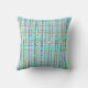 This throw pillow has an Art Deco design of a plaid made of two shades of turquoise, two shades of purple, and two shades of green.