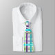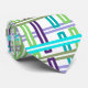 This necktie has an Art Deco design of a plaid made of two shades of turquoise, two shades of purple, and two shades of green.