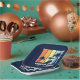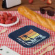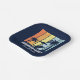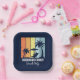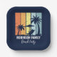 Personalised navy blue beach party paper plates for your family trip to Hawaii, Florida, or other tropical island destinations. Cool palm trees sway against retro colours of orange and yellow above your customised vacation name in white script. Great for a group going on a cruise or coastal getaway.