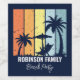 Personalised navy blue beach party wine labels for your family trip to Hawaii, Florida, or other tropical island destinations. Cool palm trees sway against retro colours of orange and yellow above your customised vacation name in white script. Great for a group going on a cruise or coastal getaway.