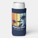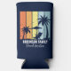Personalised navy blue beach seltzer can coolers for your family trip to Hawaii, Florida, or other tropical island destinations. Cool palm trees sway against retro colours of orange and yellow above your customised vacation name in white script. Matching keepsake gifts are great for a group going on a cruise or coastal getaway.