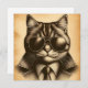 This retro-style art shows a black line drawing on sepia of a cat wearing aviator sunglasses and in a businessman, detective, policeman, or spy suit.
