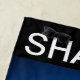 Cool underwater sharks view silhouette beach towels with image of four mako sharks in the ocean swimming and the word shark boldly printed in big typography style. Designed as a pool towel or summer beach towel for travel or leisure.