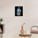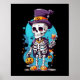 A poster with an illustration of a humourous skeleton. Wearing a top hat, holding a drink. He has a big smile on his face. Cute and spooky fun for Halloween.