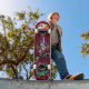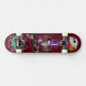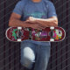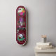 The cool skateboard deck has a trio of tattoo style skulls on a red to burgundy background. At the top there is a fun Candy Skull with four roses in pop colours. In the centre there is a wicked skull wearing a purple tophat. There are two roses on either side with a raven just below. Below that is a banner that reads, "Let it Roll." The third skull has blue accents, fangs, and three roses.