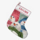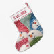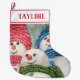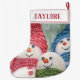A Cool Snow Family Christmas Stocking that you can customise with your own Name. 3 Snowmen wearing scarves and head gear in colours of green, red, and blue with matching buttons down their front bellies