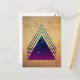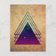 A cool sci-fi illustration with a grunge background. The background is an aged grungy antique brown colour. The illustration is composed of a big triangle filled with blue and purple outer space imagery and texture. This triangle is surrounded by several blueish purple triangle outlines which stack upward.