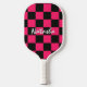 Stand out on the court with this cool pickleball paddle. With a vibrant design of hot pink and contrasting black squares in a chequered pattern, the paddle makes a stylish choice for the bold player. The reverse side of the paddle is plain black. Personalise the paddle with a name, which will appear in script typography on the chequered side. Combining function and style into a sleek and modern look, the paddle makes an ideal custom gift for pickleball lovers.