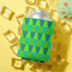 This can cooler has a Bauhaus design of repeating trapezoids in shades of blue and green.
