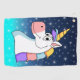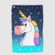The coolest unicorn that ever lived with a long flowing multi coloured mane and a golden, ok yellow horn. His body is white with a pink nose and pink ear. The background is a gradient of dark to light blue and dotted with white sparkles, just to add some unicorn magic.