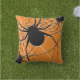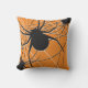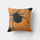 This modern orange and black Halloween outdoor pillow features three bold spiders on a stylish abstract spider web patterned backdrop with black and white highlights. A layered design gives depth and a unique perspective to the overall design of this cool and unique outdoor Halloween pillow.