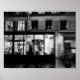 Blurry motion image of man walking in front of a restaurant at night in Paris. Cool, urban and modern black and white photography of Parisian lifestyle and culture