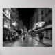 Blurry motion image of people walking on street passing by cafes and bistros at night in Paris. Black and white photography of urban culture Parisian lifestyle.