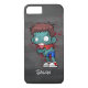 A macabre phone case with a cool looking zombie guy, wearing ripped and tattered clothing with arms outstretched looking for brains. Big wide vacant eyes with a sickly green rotting skin. A paint splatter which looks like a blood splatter in the background behind the zombie. Set on a charcoal black grunge style background with faded stripes. Personalise with a name.