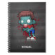 A macabre personalised spiral notebook with a cool looking zombie guy. Wearing ripped and tattered clothing with arms outstretched looking for brains. Big wide vacant eyes with a sickly green rotting skin. A paint splatter which looks like a blood splatter in the background behind the zombie.
